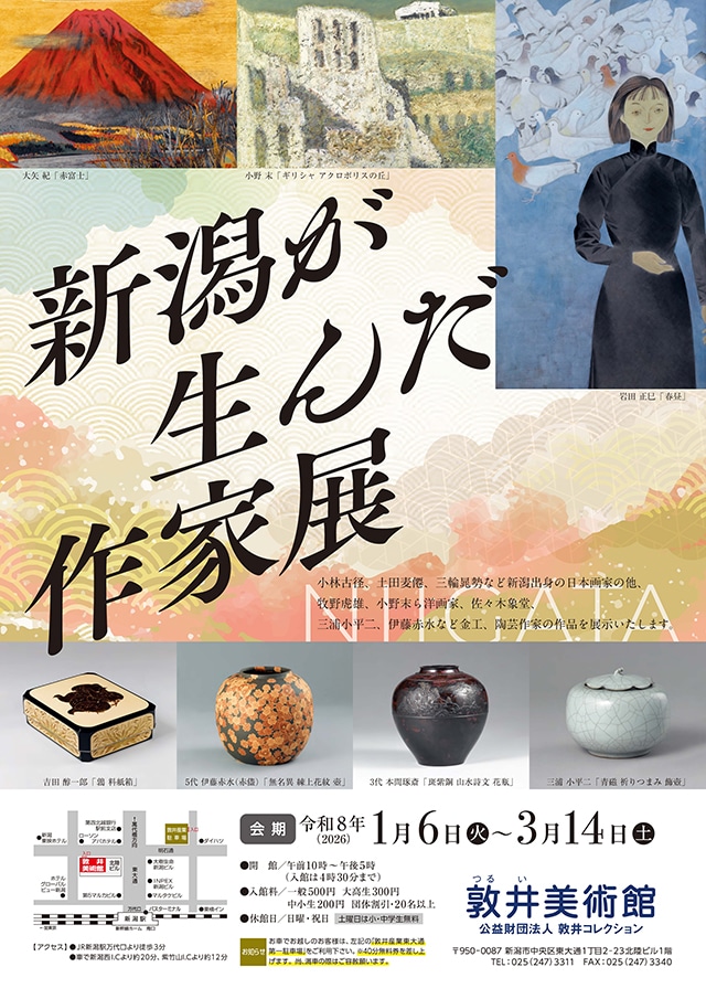 小林古径、土田麦僊、三輪晁勢など新潟出身の日本画家の他、牧野虎雄、小野末ら洋画家、佐々木象堂、三浦小平二、伊藤赤水など金工、陶芸作家の作品を展示いたします。